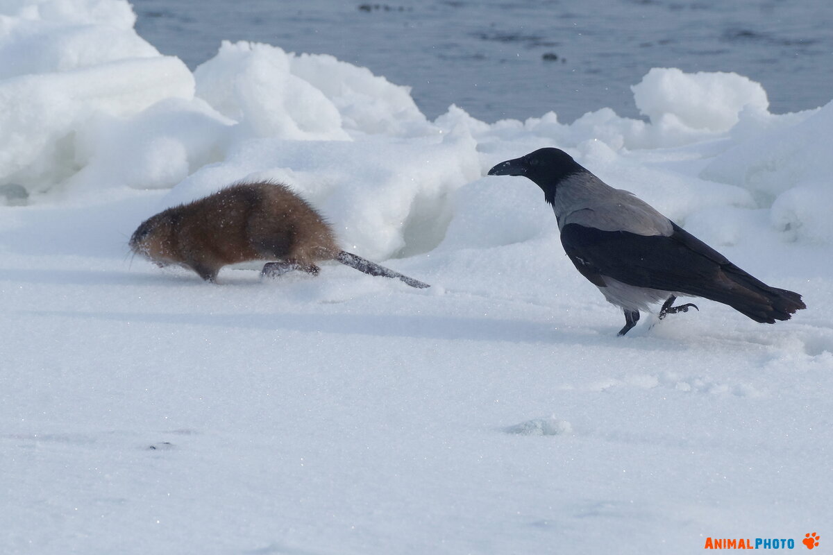 На льду на берегу Волги несколько ворон напали на крысу. Она убегала в сторону открытой воды.Учитывая, что ворон было 5 или 6, шансов спастись у неё мало.